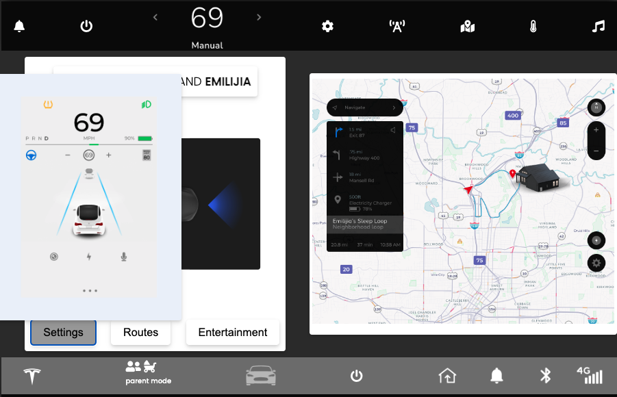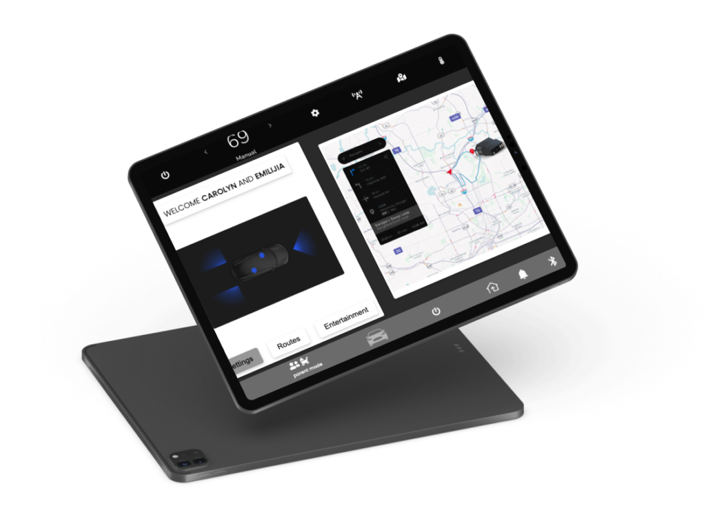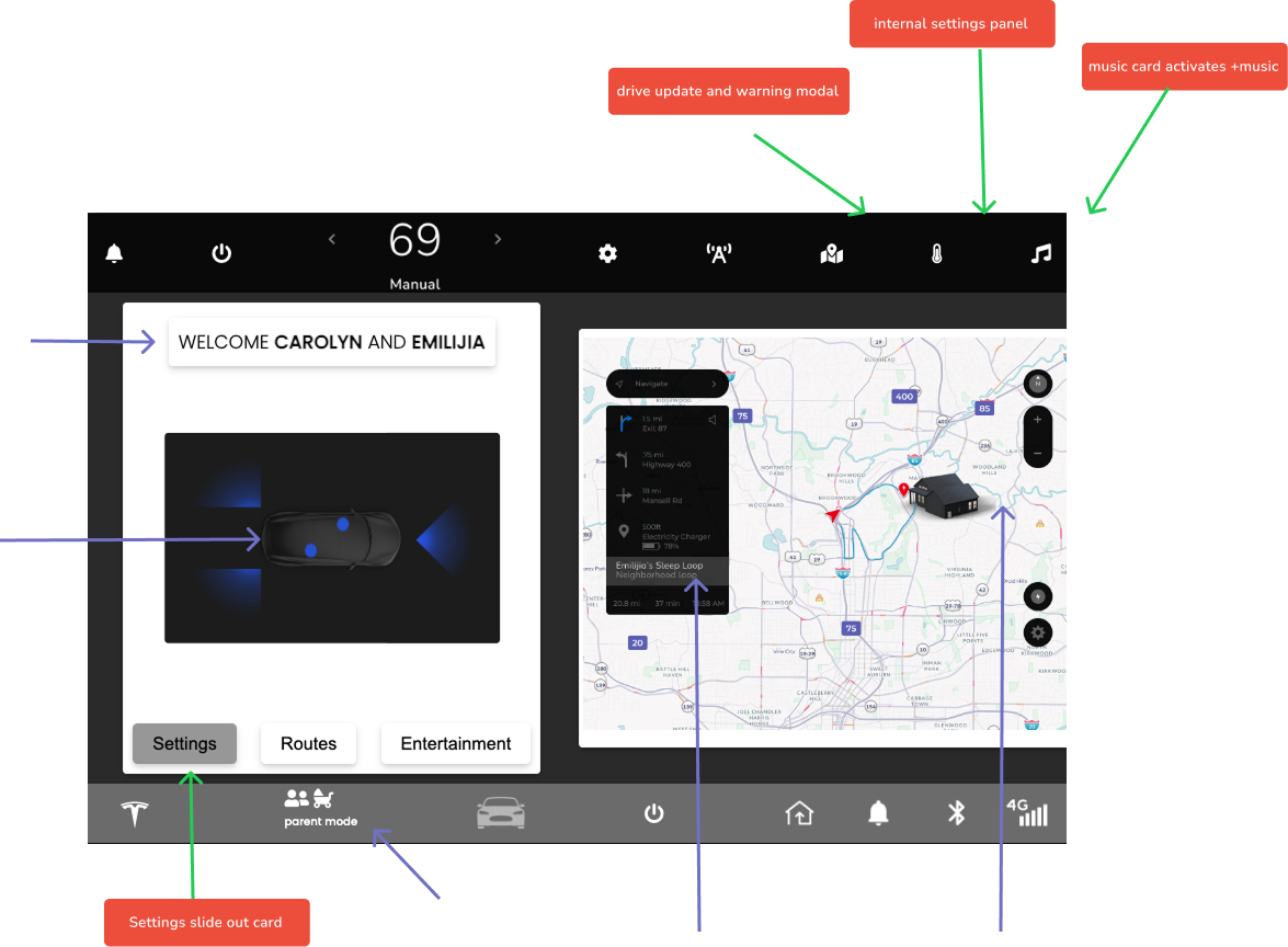 • Top nav includes; trip saftey updates, music, speed, settings, and internal settings panel.